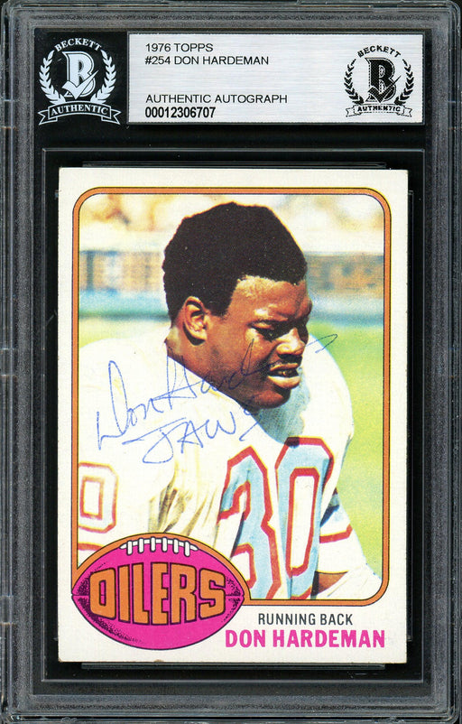 This is a 1976 Topps Rookie Card #254 that has been hand signed by Don "Jaws" Hardeman. It has been certified authentic by Beckett Authentication (...