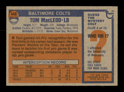 This is a 1976 Topps Rookie Card #440 that has been hand signed by Tom MacLeod. This item is guaranteed to pass any third party authentication comp...