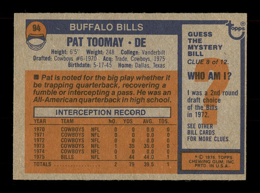 $10.00Pat Toomay Autographed 1976 Topps Card #94 Buffalo Bills SKU #171171