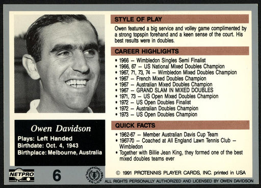 This is a 1991 NetPro The Legends Card #6 that has been hand signed by Owen Davidson. This item is guaranteed to pass any third party authenticatio...