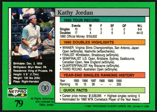 This is a 1991 NetPro Tour Star Card #79 that has been hand signed by Kathy Jordan. This item is guaranteed to pass any third party authentication ...