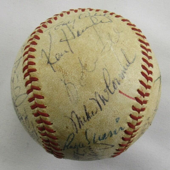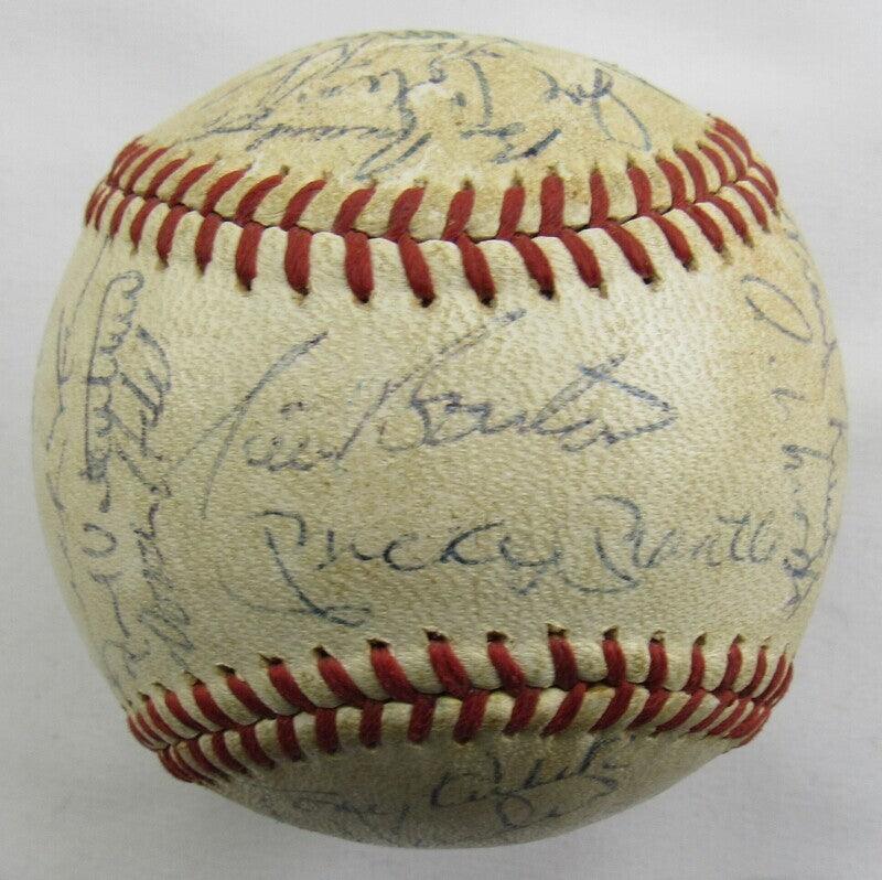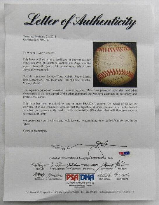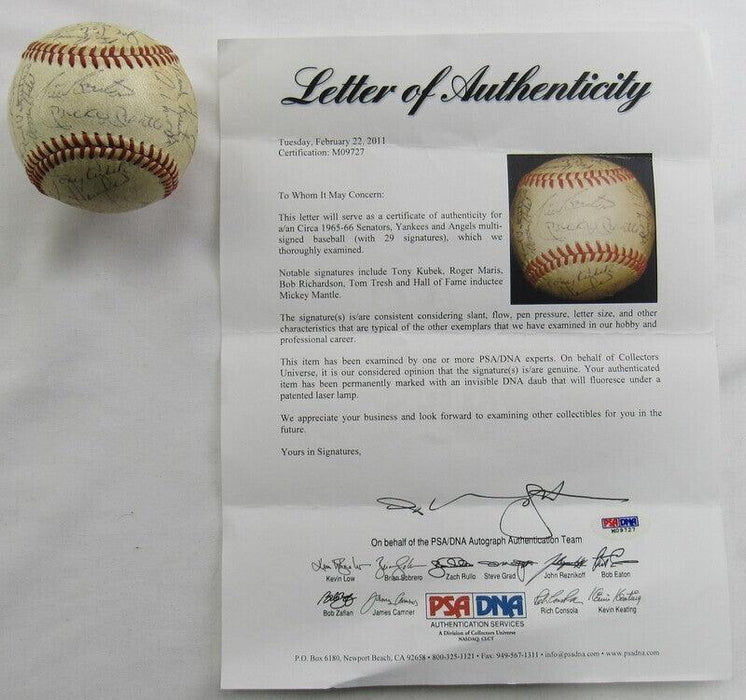 1965 Yankees Senators Angles Signed Baseball PSA/DNA M09727 - 29 Signatures: Mickey Mantle, Roger Maris, Dick Wantz, Jim Bouton, Tony Kubek, Ken Hamlin, Bob Lee, Mike McCormick, Jim King, Bobby Richardson, Joe Coleman, Ron Kline, Rudy May, Ed Brinkman, Brant Alyea, Ed Yost, Hector Lopez, Roy White, Tom Tresh, Don Blasingame, Pete Richert, Dick Nen, Fred Valentine, Woodie Held, Pete Craig, Al Downing, Al Spangler, Frank Kreutzer, Archie Moore
