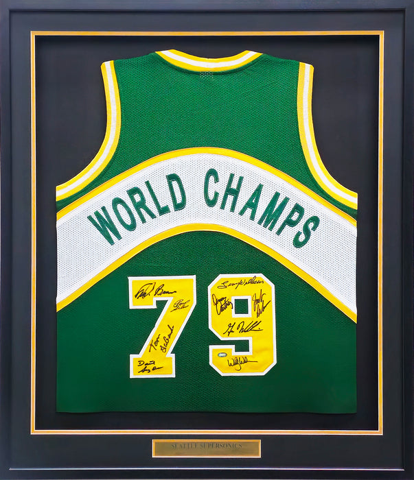 This is a framed Green Jersey, approximately 31x36 with the frame, that has been hand signed by 9 members of the 1978-79 NBA Champions Seattle Supersonics Team. Members that signed this jersey are Lenny Wilkens, Fred Brown, Gus Williams, Jack Sikma, Paul Silas, Wally Walker, Dennis Awtrey, Dick Snyder and Tom LaGarde. This item was signed in the presence of a Mill Creek Sports representative and comes with their serial numbered hologram and matching certificate of authenticity.