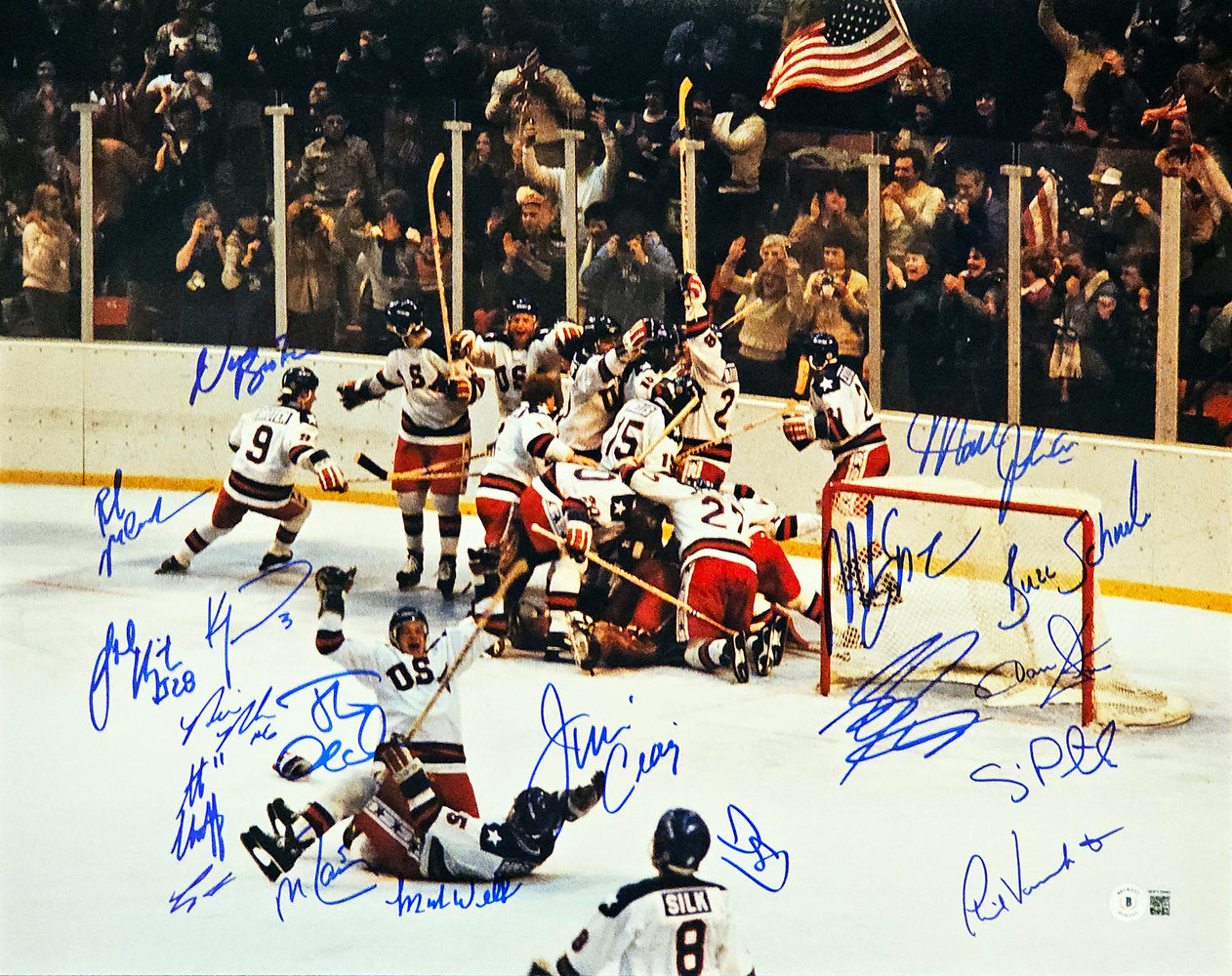 This is a 16x20 Photo that has been hand signed by 19 members of the 1980 Team USA Olympic Hockey Team. The 19 members of the Miracle On Ice/Do You Believe In Miracles? team include: Jim Craig, Mike Eruzione, Steve Janaszak, Bill Baker, Dave Christian, Ken Morrow, Jack O'Callahan, Mike Ramsey, Neal Broten, Steve Christoff, John Harrington, Mark Johnson, Rob McClanahan, Buzz Schneider, Dave Silk, Eric Strobel, Phil Verchota, Mark Wells, Craig Patrick. This item has been witnessed and certified authentic by Beckett Authentication (BAS) and comes with their tamper-proof witness sticker.