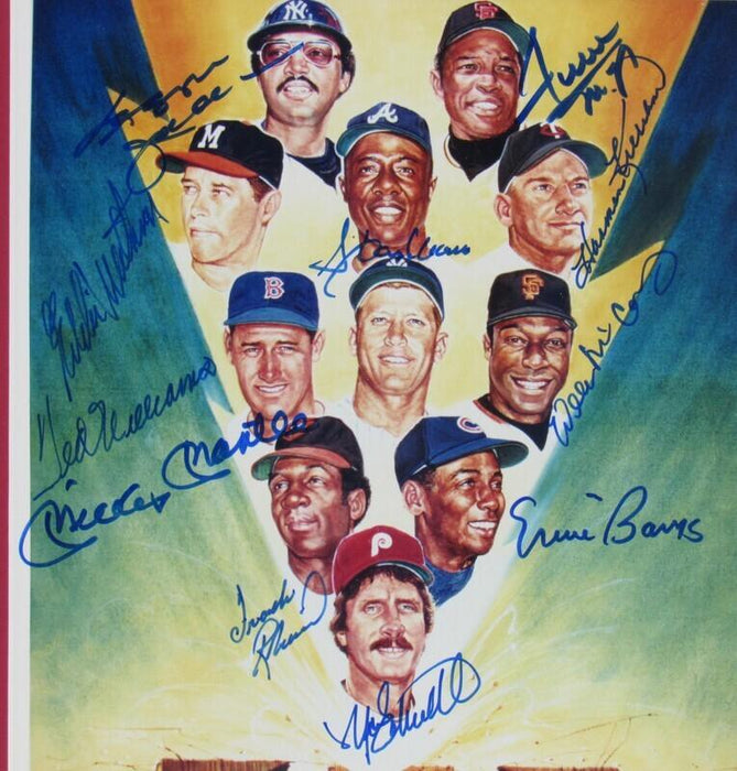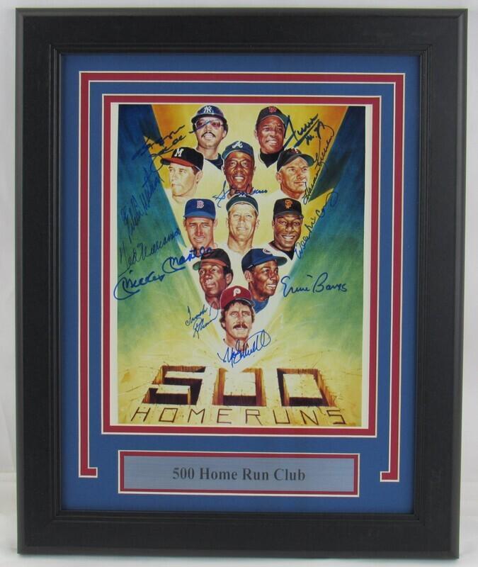 500 Home Run Club Signed Framed 8x10 Photo- Mickey Mantle, Reggie Jackson, Ted Williams, Willie Mays, Harmon Killebrew, Ernie Banks, Eddie Mathews, Mike Schmidt, Hank Aaron, Willie McCovey, Frank Robinson - Frame measures approximately 13x16 overall