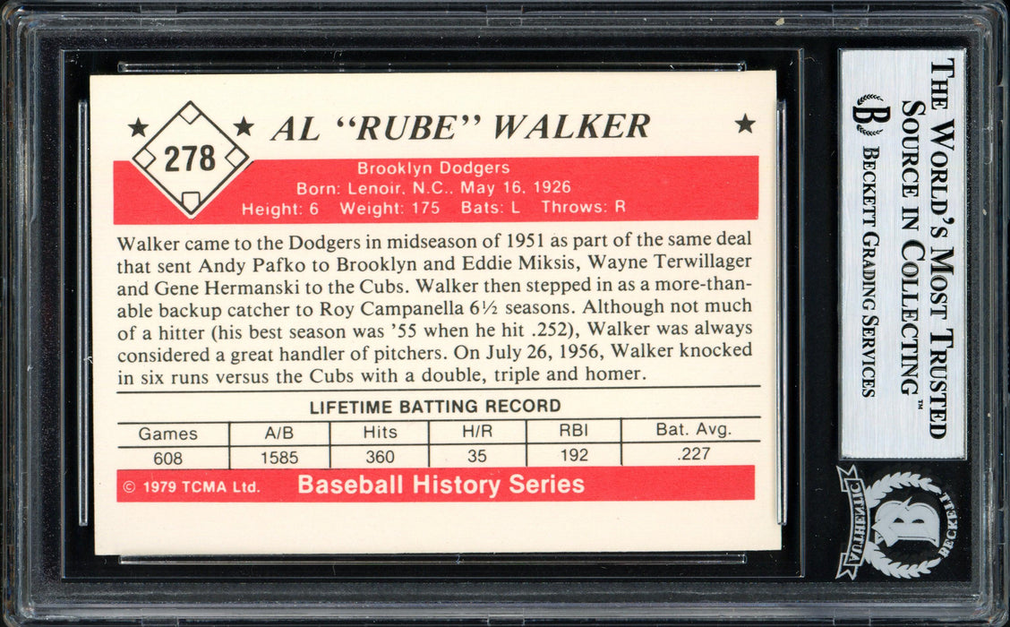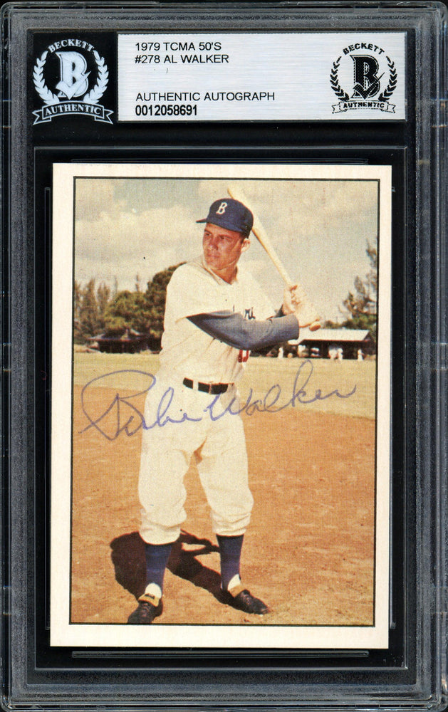This is a 1979 TCMA Card #278 that has been hand signed by Al "Rube" Walker. It has been certified authentic by Beckett Authentication (BAS) and comes encapsulated in their tamper-proof holder.