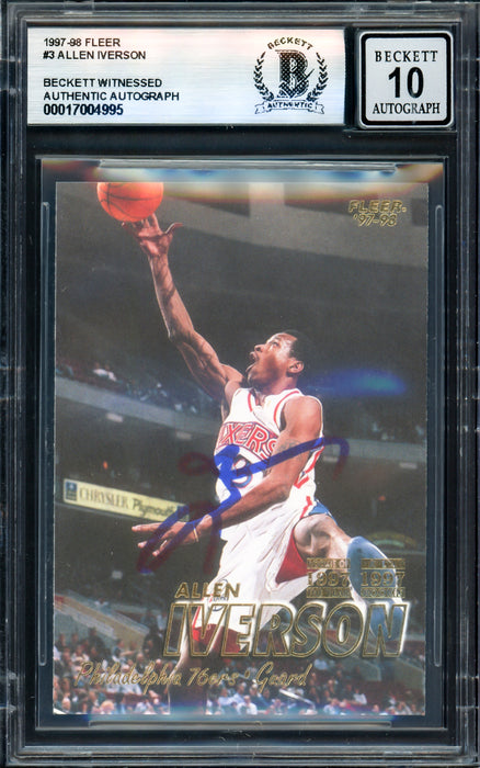 This is a 1997-98 Fleer Card #3 that has been hand signed by Allen Iverson. The condition of the signature was graded a Gem Mint 10 by Beckett BAS Witness. It has been witnessed and certified authentic by Beckett BAS Witness and comes encapsulated in their tamper-proof holder.