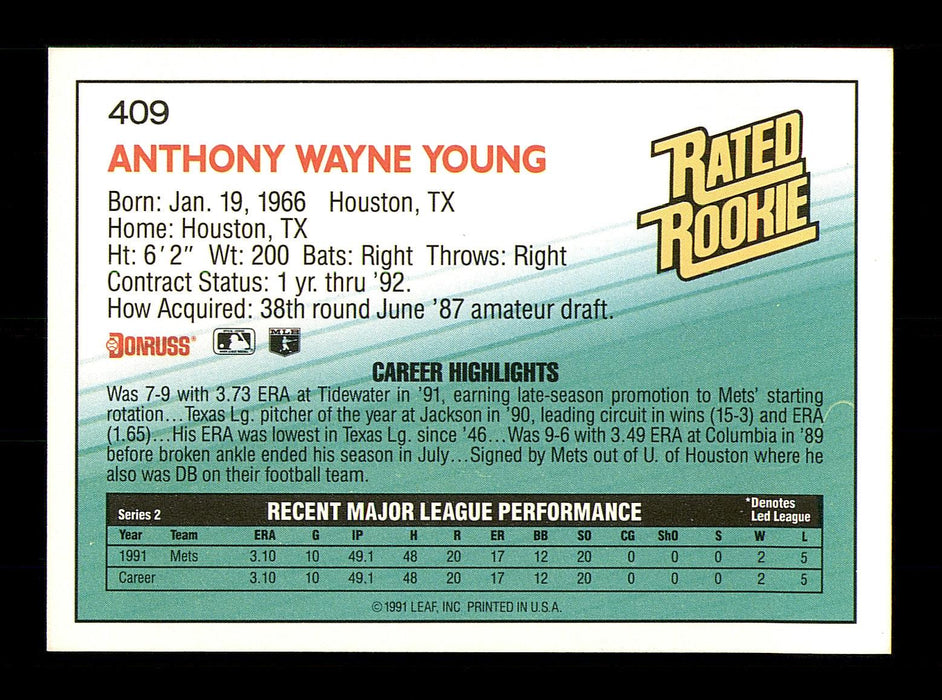 Anthony Young Autographed 1992 Donruss Card #409 New York Mets SKU #184579