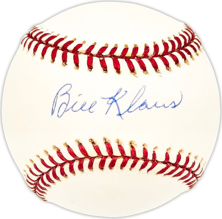 This is an Official American League Baseball that has been hand signed by Bill Klaus. This item has been certified authentic by Beckett Authentication (BAS) and comes with their tamper-proof QR Code hologram that can be verified on the Beckett-authentication.com.