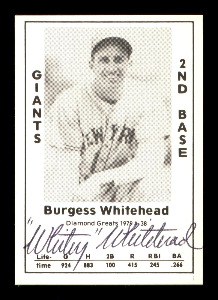 This is a 1979 Diamond Greats Card #38 that has been hand signed by Burgess "Whitey" Whitehead. This item is guaranteed to pass any third party authentication company including Beckett, PSA/DNA and JSA authentication.