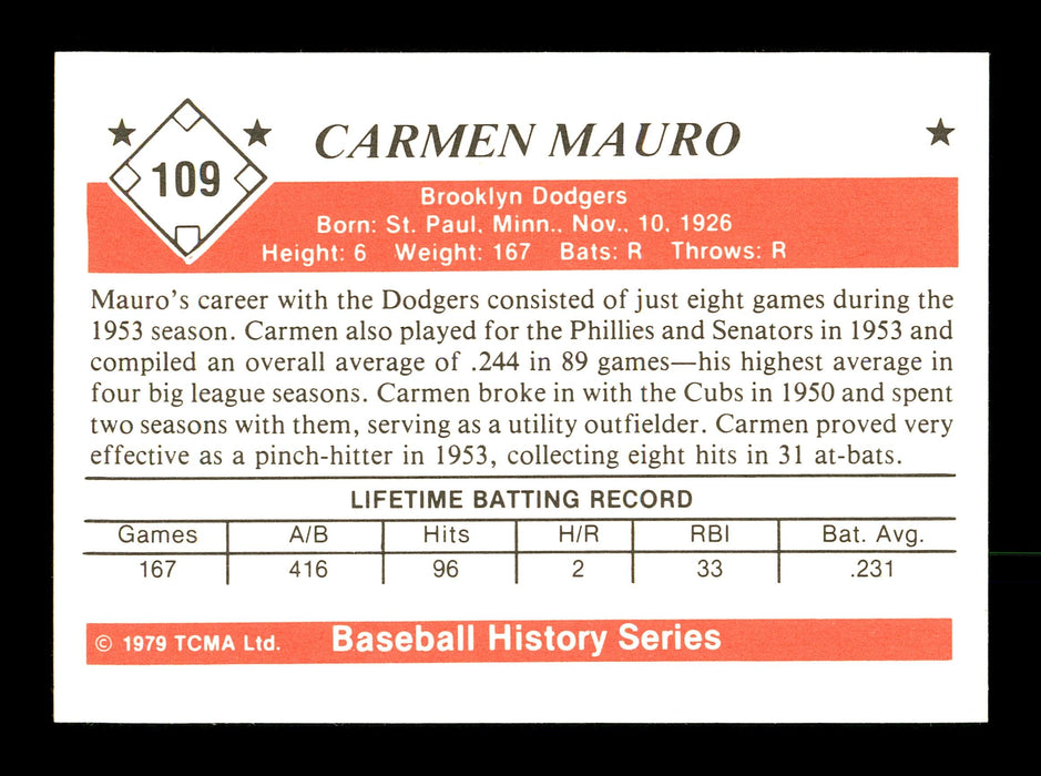 Carmen Mauro Autographed 1979 TCMA Card #109 Brooklyn Dodgers "To Geoffrey Best Wishes" SKU #171768