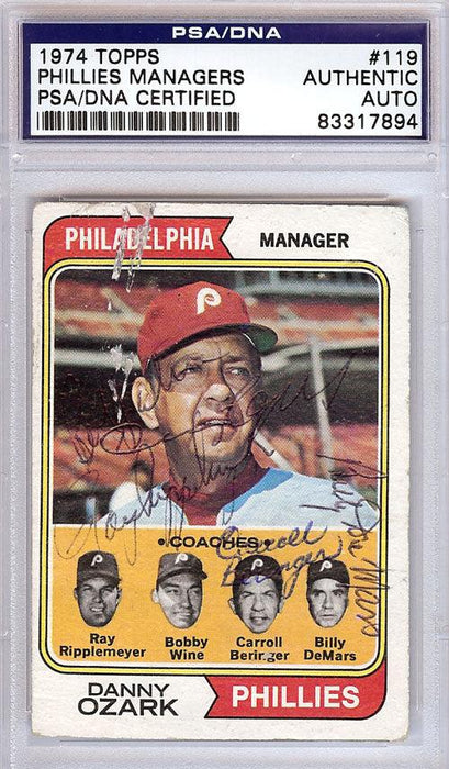 Carroll Beringer, Danny Ozark, Ray Rippelmeyer, Bobby Wine & Billy Demars Autographed 1974 Topps Card #119 Philadelphia Phillies PSA/DNA #83317894