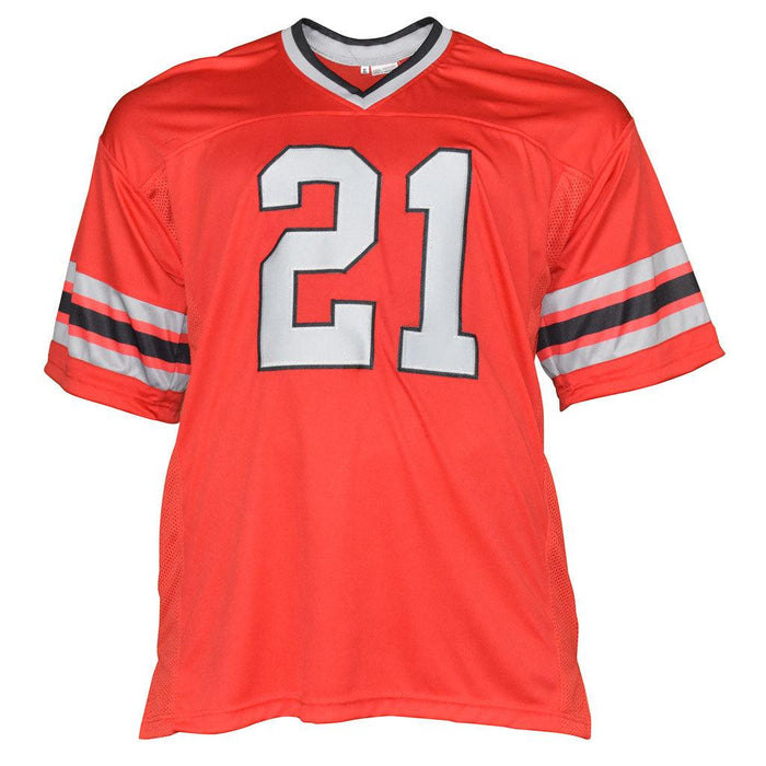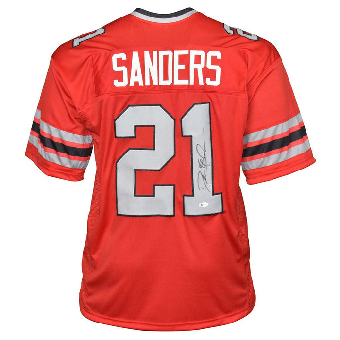 - A professional style red custom replica football jersey autographed by Deion Sanders and authenticated by Beckett