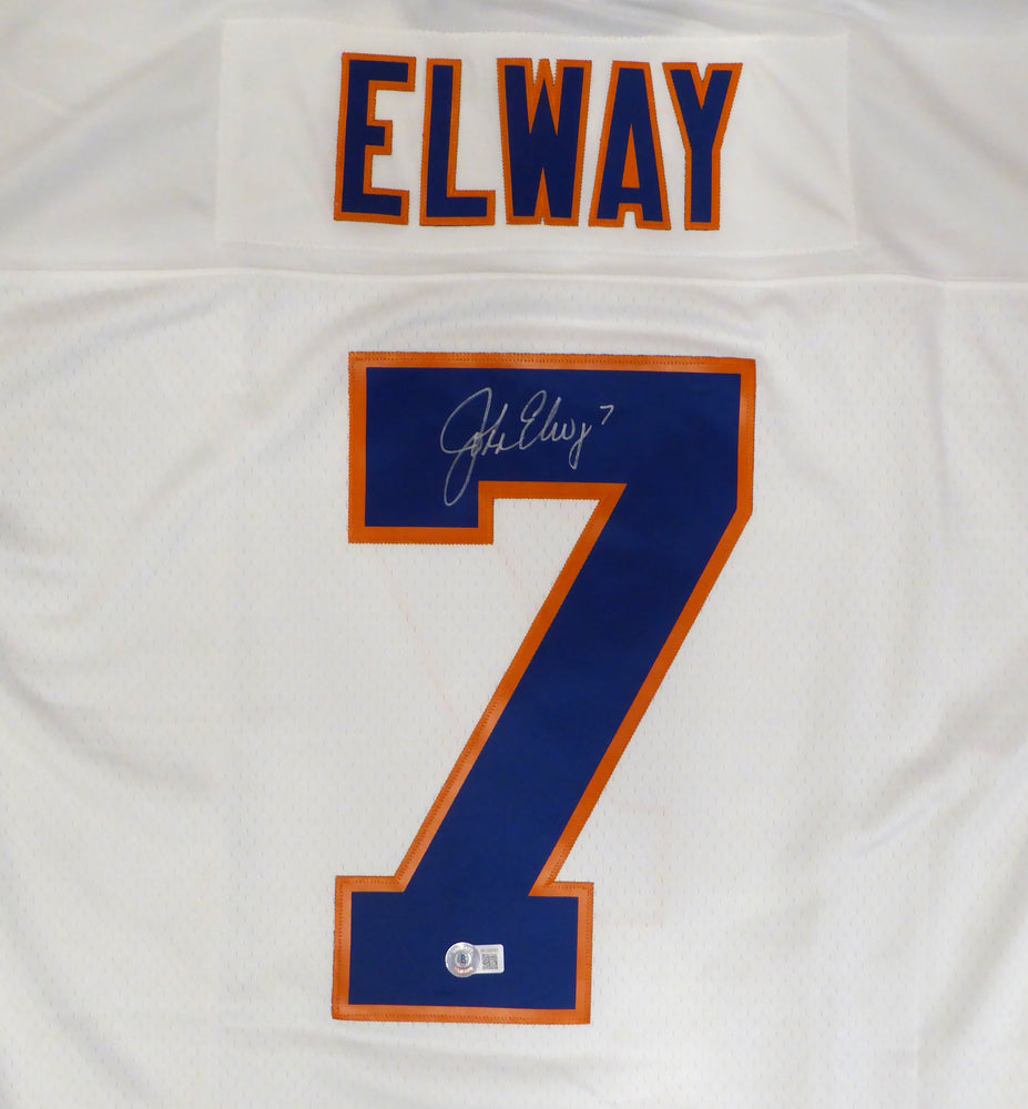 This is a White Authentic Mitchell and Ness Denver Broncos Jersey that has been hand signed by John Elway. This jersey is Size 44. There are marks on the item as shown. This item has been certified authentic by Beckett Authentication (BAS) and comes with their tamper-proof QR Code sticker that can be verified on the Beckett-authentication.com.