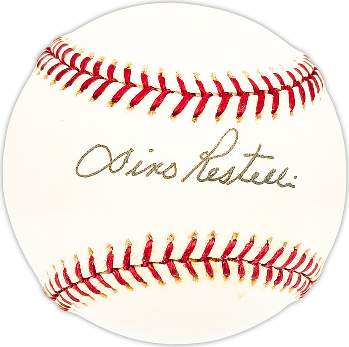 This is an Official National League Baseball that has been hand signed by Dino Restelli. There is toning in the item as shown. This item has been certified authentic by Beckett Authentication (BAS) and comes with their tamper-proof QR Code hologram that can be verified on the Beckett-authentication.com.