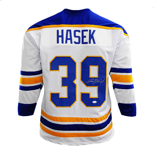 A professional-style Buffalo hockey jersey autographed by Dominik Hasek and authenticated by JSA.