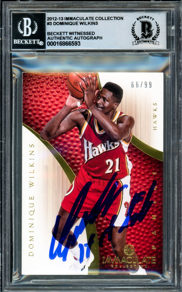 This is a 2012-13 Immaculate Collection Card #3 that has been hand signed by Dominique Wilkins. The condition of the signature was graded a Gem Mint 10 by Beckett BAS Witness. This item was inscribed "HH Film" (Human Highlight Film). This is a limited edition item that has been serial numbered #66/99. It has been witnessed and certified authentic by Beckett BAS Witness and comes encapsulated in their tamper-proof holder.
