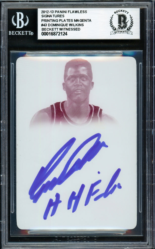This is a 2012-13 Panini Flawless Signatures Printing Plate Magenta Card #43 that has been hand signed by Dominique Wilkins. This item was inscribed "HH Film" (Human Highlight Film). This is a limited edition item that has been serial numbered #1/1. It has been witnessed and certified authentic by Beckett BAS Witness and comes encapsulated in their tamper-proof holder.