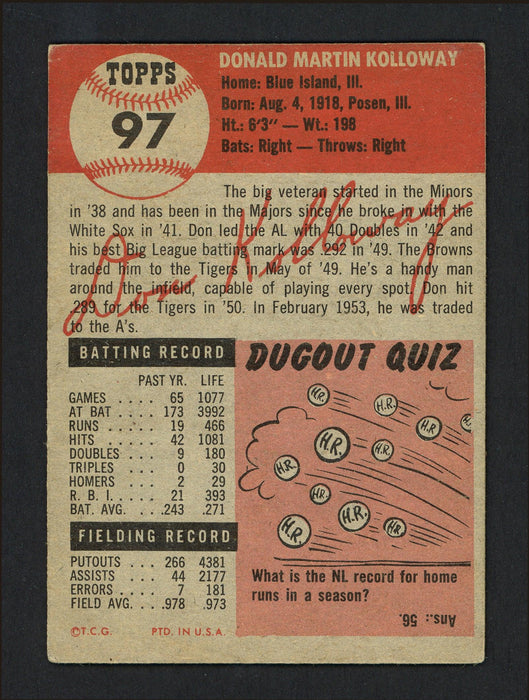 Don Kolloway Autographed 1953 Topps Card #97 Philadelphia A's SKU #164280
