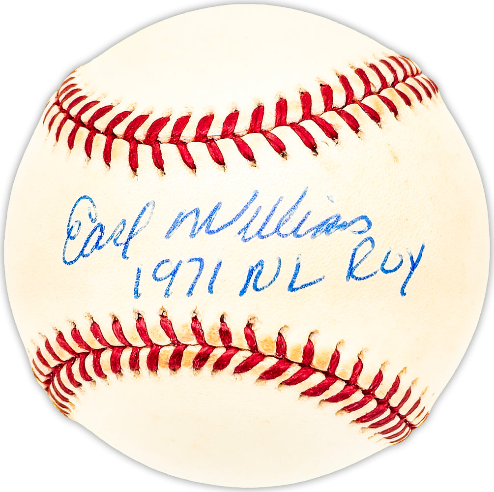 This is an Official MLB Baseball that has been hand signed by Earl Williams. This item was inscribed "1971 NL ROY." There is toning in the item as shown. This item has been certified authentic by Beckett Authentication (BAS) and comes with their tamper-proof QR Code hologram that can be verified on the Beckett-authentication.com.