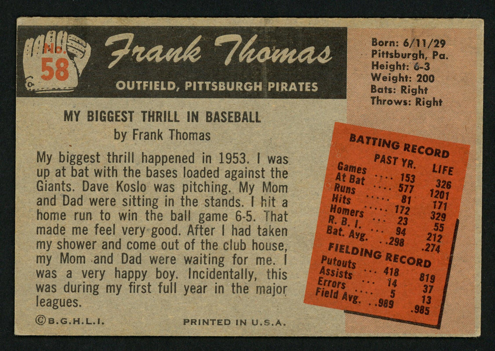 Frank Thomas Autographed 1955 Bowman Card #58 Pittsburgh Pirates SKU #153496