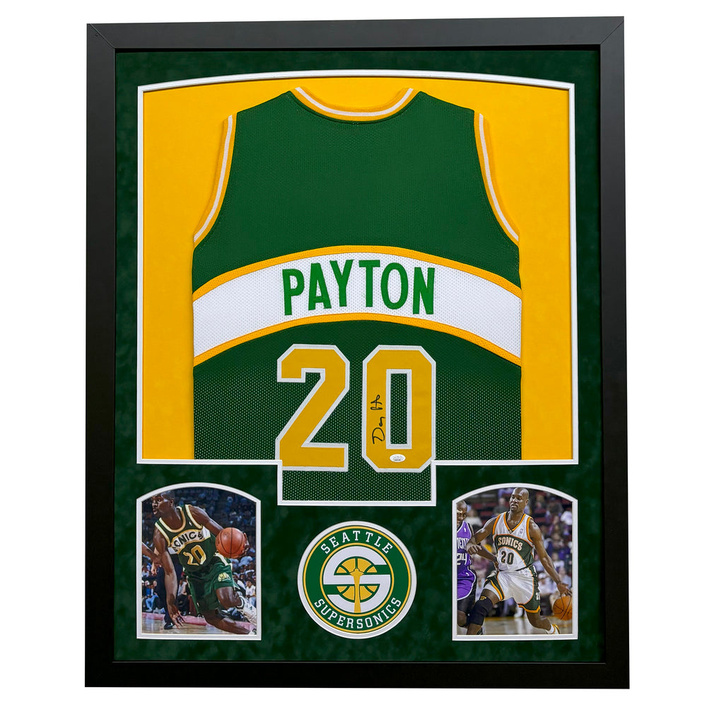 Gary Payton professionally framed hand signed, custom stitched football jersey with premium suede matte, wood frame and plexiglass cover.