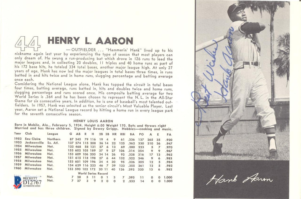 Hank Aaron Autographed 5x8 Magazine Page Photo Milwaukee Braves "Best Wishes" Vintage Playing Days Signature Beckett BAS #D12767