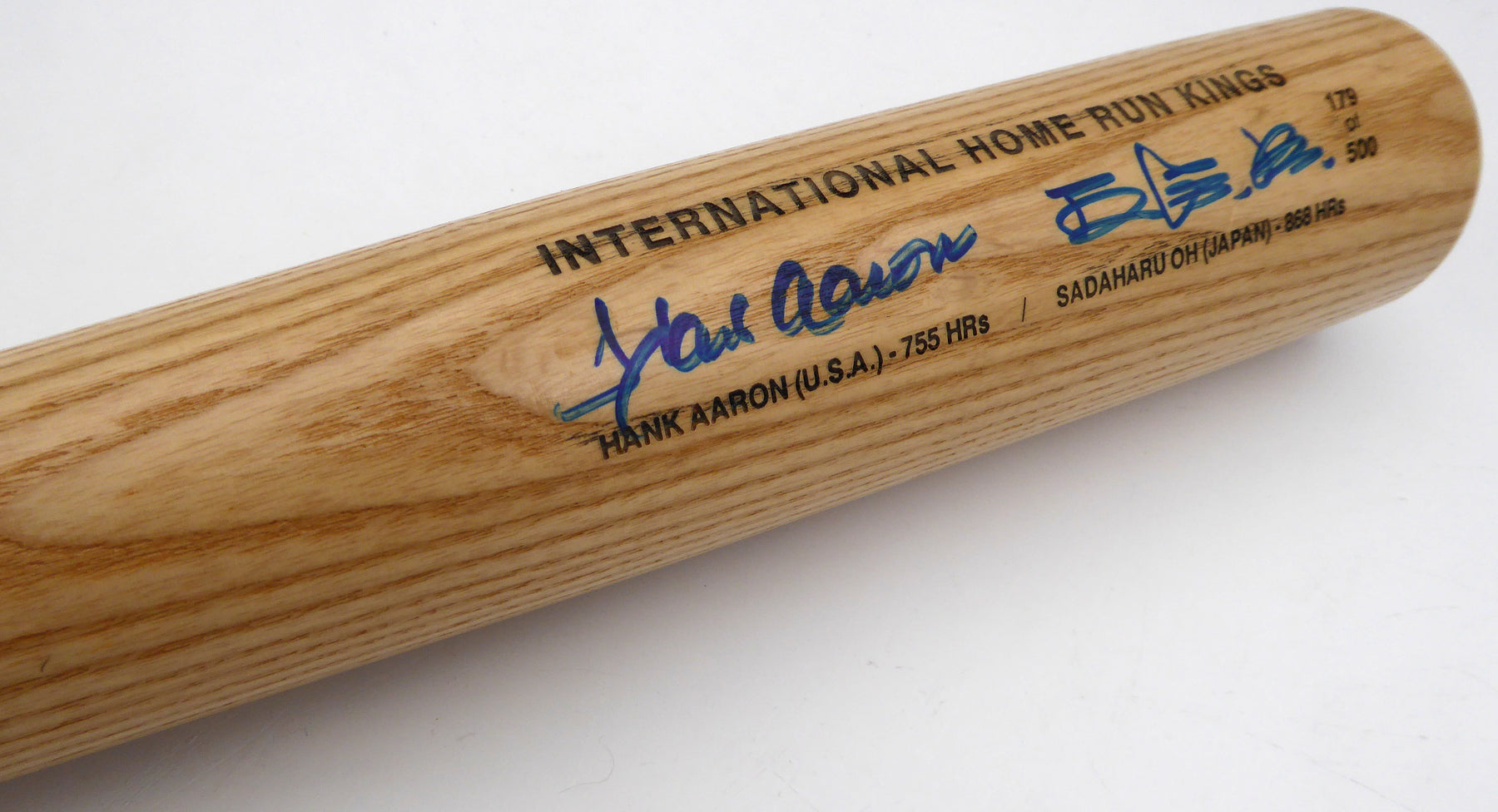 This is a Rawlings International HR Kings Bat that has been hand signed by Hank Aaron and Sadaharu Oh.