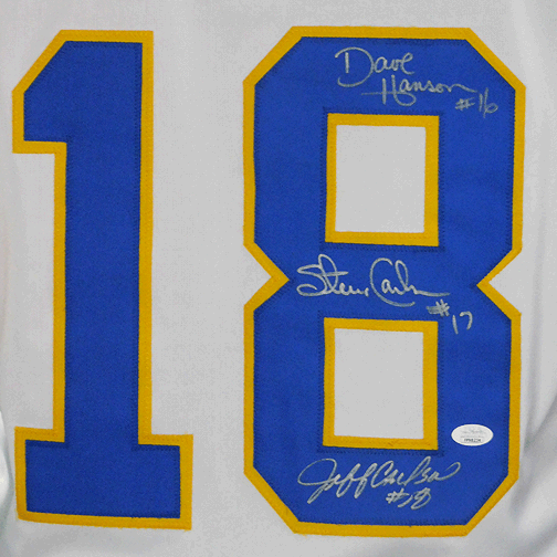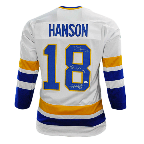 Hanson Brothers Signed Slap Shot White Hockey Jersey (JSA)