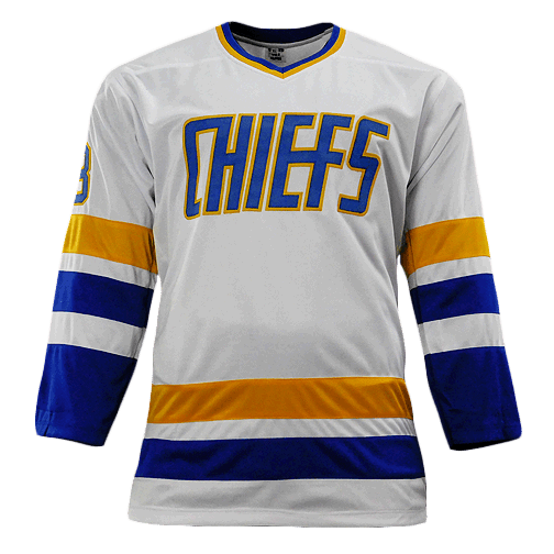 A professional style Chiefs hockey jersey autographed by the Hanson Brothers from the 1977 movie Slap Shot (David Hanson, Jeff Carlson, and Steve Carlson) and authenticated by JSA.