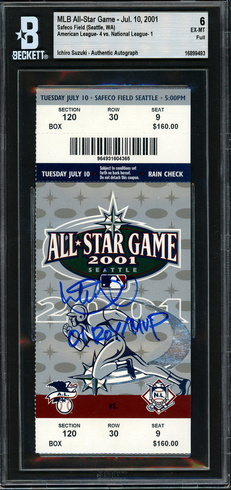 This is a 2001 All Star Game Ticket, approximately 3.5x7, that has been hand signed by Ichiro Suzuki. The condition of this item was graded a 6 by BGS. This item was inscribed "01 ROY/MVP." It has been certified authentic by Beckett Authentication Services (BAS) and comes encapsulated in their tamper-proof holder.