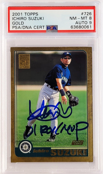This is a 2001 Topps Gold Rookie Card #726 that has been hand signed by Ichiro Suzuki. The condition of this card was graded a Near Mint/Mint 8 by PSA. The condition of the signature was graded a Mint 9 by PSA/DNA. This item was inscribed "01 ROY MVP." It has been certified authentic by PSA/DNA and comes encapsulated in their tamper-proof holder.