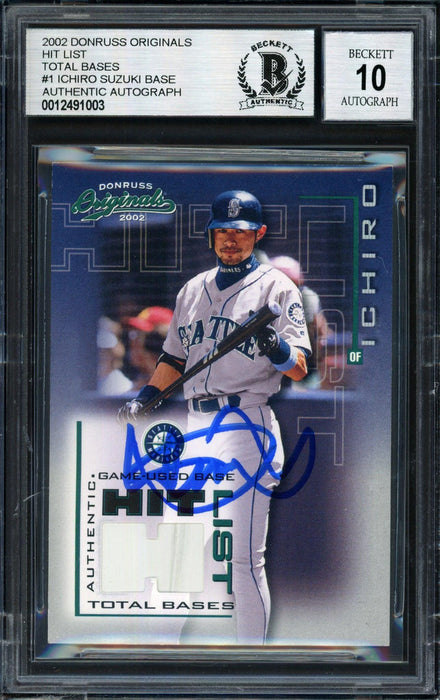 This is a 2002 Donruss Originals Hit List Base Card #HL-1 that has been hand signed by Ichiro Suzuki. This card contains a game-used base relic worn by Ichiro in an official MLB game. This is a limited edition item that has been serial numbered #89/316. The signature was graded a 10 by Beckett. It has been certified authentic by Beckett Authentication (BAS) and comes encapsulated in their tamper-proof holder.