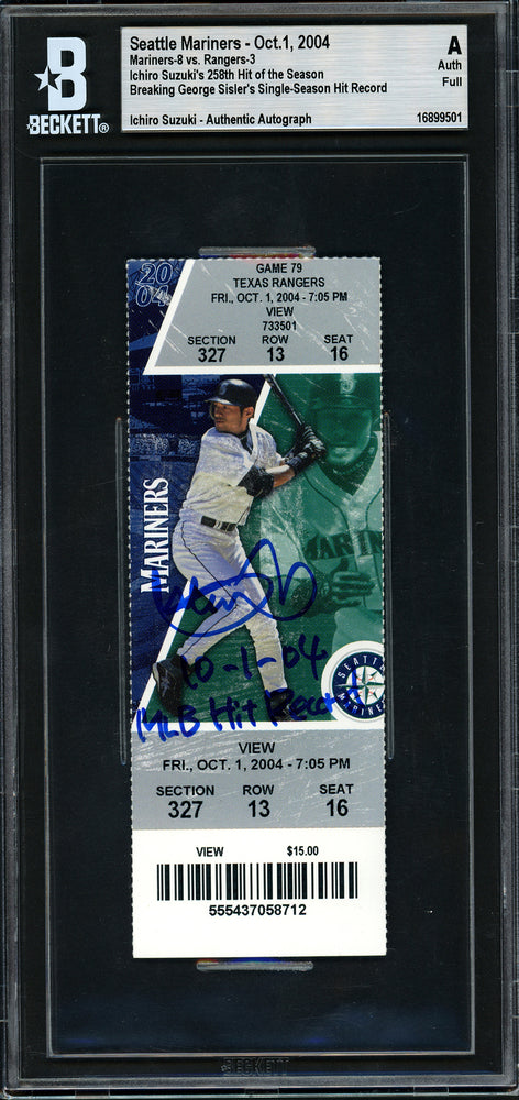 This is an October 1st, 2004 Ticket, approximately 2x6, that has been hand signed by Ichiro Suzuki. This item was inscribed "10-1-04 MLB Hit Record." Ichiro broke George Sisler's MLB all-time single season hit record in this game. It has been certified authentic by Beckett Authentication Services (BAS) and comes encapsulated in their tamper-proof holder.