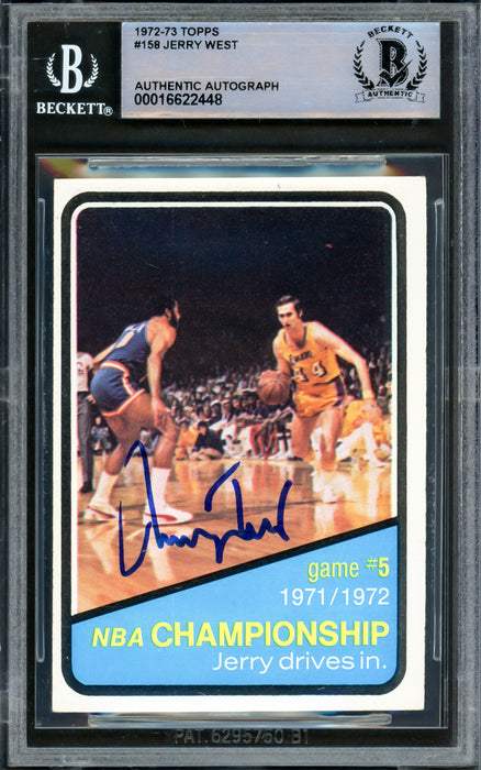 This is a 1972-73 Topps Card #158 that has been hand signed by Jerry West. It has been certified authentic by Beckett Authentication Services (BAS) and comes encapsulated in their tamper-proof holder.