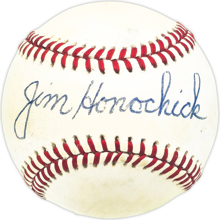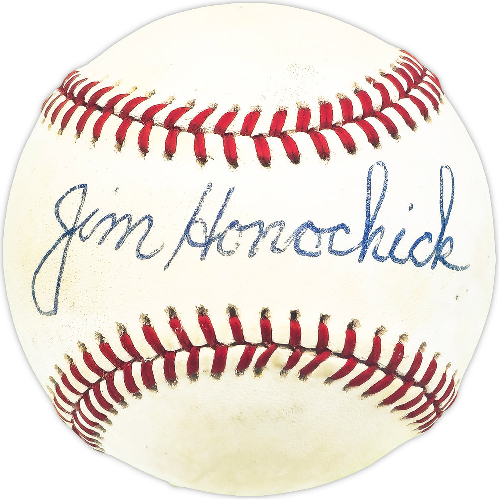 This is an Official National League Baseball that has been hand signed by Jim Honochick. There is toning in the item as shown. This item has been certified authentic by Beckett Authentication (BAS) and comes with their tamper-proof QR Code hologram that can be verified on the Beckett-authentication.com.