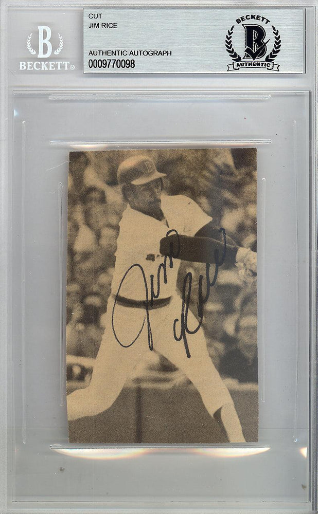 This is a 2.5x4 Newspaper Page Photo that has been hand signed by Jim Rice. It has been certified authentic by Beckett Authentication (BAS) and comes encapsulated in their tamper-proof holder.
