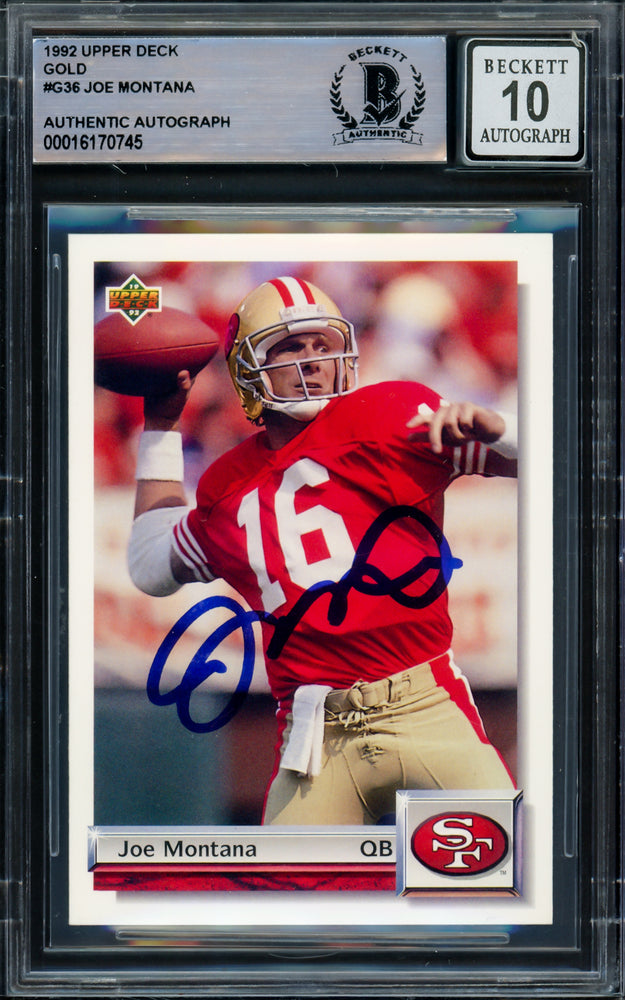 This is a 1992 Upper Deck Card #G36 that has been hand signed by Joe Montana. The condition of the signature was graded a Gem Mint 10 by Beckett BAS. It has been certified authentic by Beckett Authentication Services (BAS) and comes encapsulated in their tamper-proof holder.