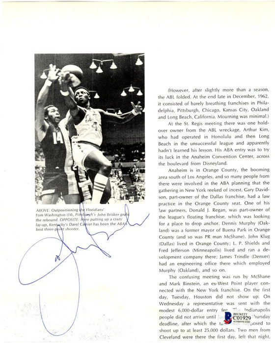 This is a 7.5x9 Magazine Page Photo that has been hand signed by John Brisker. Spencer Haywood signed the back of them item as shown. It has been certified authentic by Beckett Authentication (BAS) and comes with their sticker and matching certificate of authenticity.