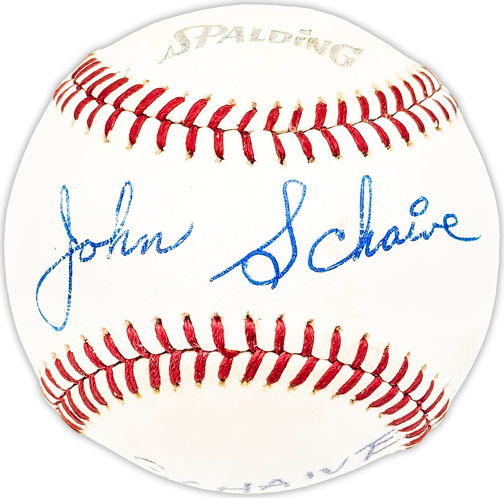 This is an Official Spalding Baseball that has been hand signed by John Johnny Schaive. There is toning in the item as shown. This item has been certified authentic by Beckett Authentication (BAS) and comes with their tamper-proof QR Code hologram that can be verified on the Beckett-authentication.com.