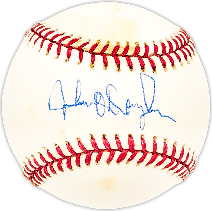 This is an Official American League Baseball that has been hand signed by John O'Donoghue. There is toning in the item as shown. This item has been certified authentic by Beckett Authentication (BAS) and comes with their tamper-proof QR Code hologram that can be verified on the Beckett-authentication.com.