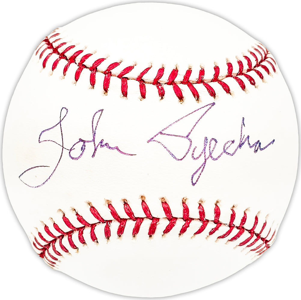 This is an Official MLB Baseball that has been hand signed by John Pyecha. This item has been certified authentic by Beckett Authentication (BAS) and comes with their tamper-proof QR Code hologram that can be verified on the Beckett-authentication.com.