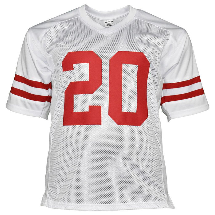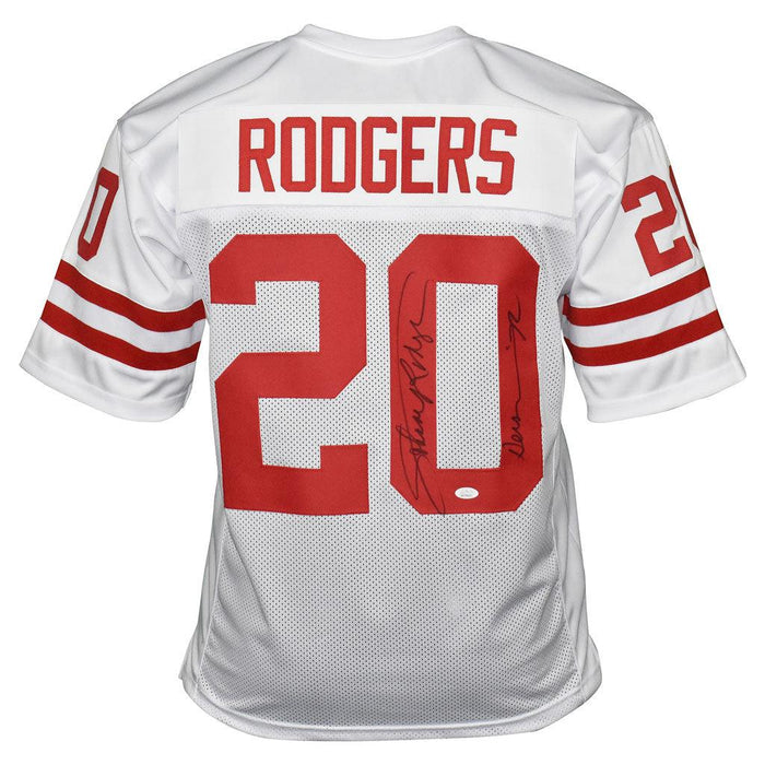 - A collegiate style white custom replica football jersey autographed by Johnny Rodgers with 72 Heisman inscription and authenticated by JSA