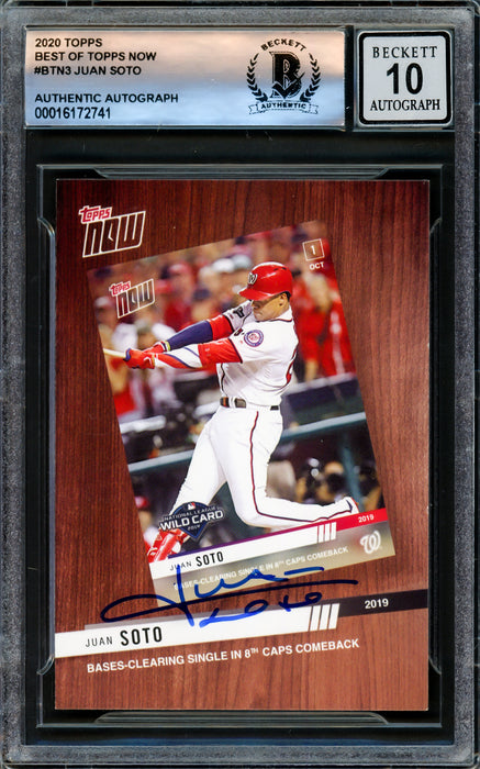 This is a 2020 Topps Now Card #BTN-3 that has been hand signed by Juan Soto. The condition of the signature was graded a Gem Mint 10 by Beckett BAS. It has been certified authentic by Beckett Authentication Services (BAS) and comes encapsulated in their tamper-proof holder.