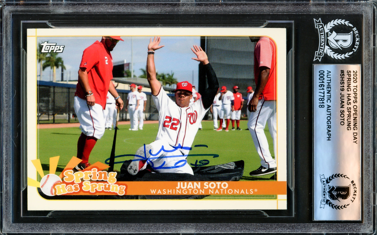 This is a 2020 Topps Opening Day Spring Has Sprung Card #SHS-19 that has been hand signed by Juan Soto. It has been certified authentic by Beckett Authentication Services (BAS) and comes encapsulated in their tamper-proof holder.
