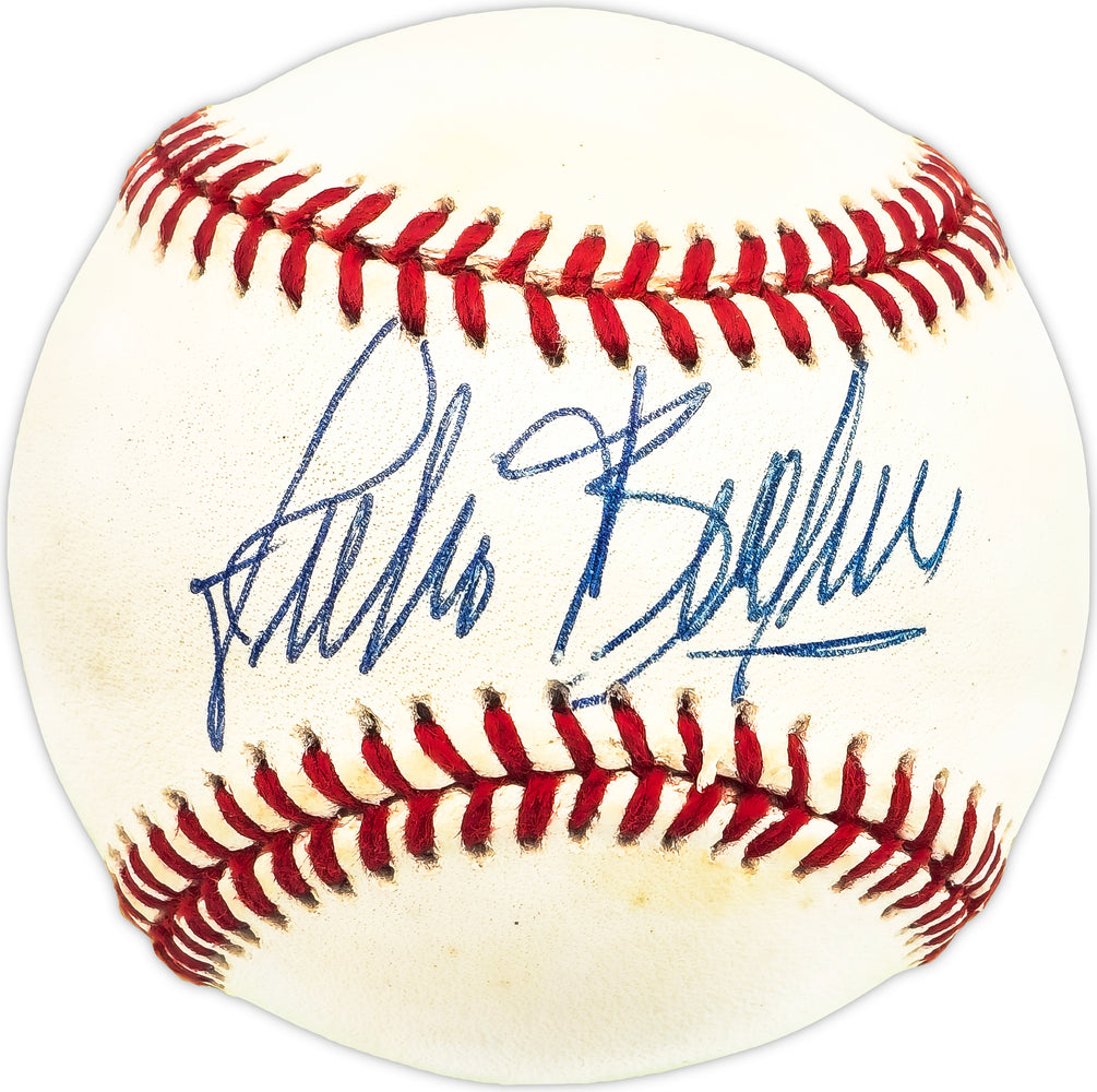 This is an Official American League Baseball that has been hand signed by Julio Becquer. There is toning in the item as shown. This item has been certified authentic by Beckett Authentication (BAS) and comes with their tamper-proof QR Code hologram that can be verified on the Beckett-authentication.com.