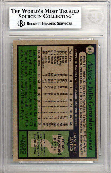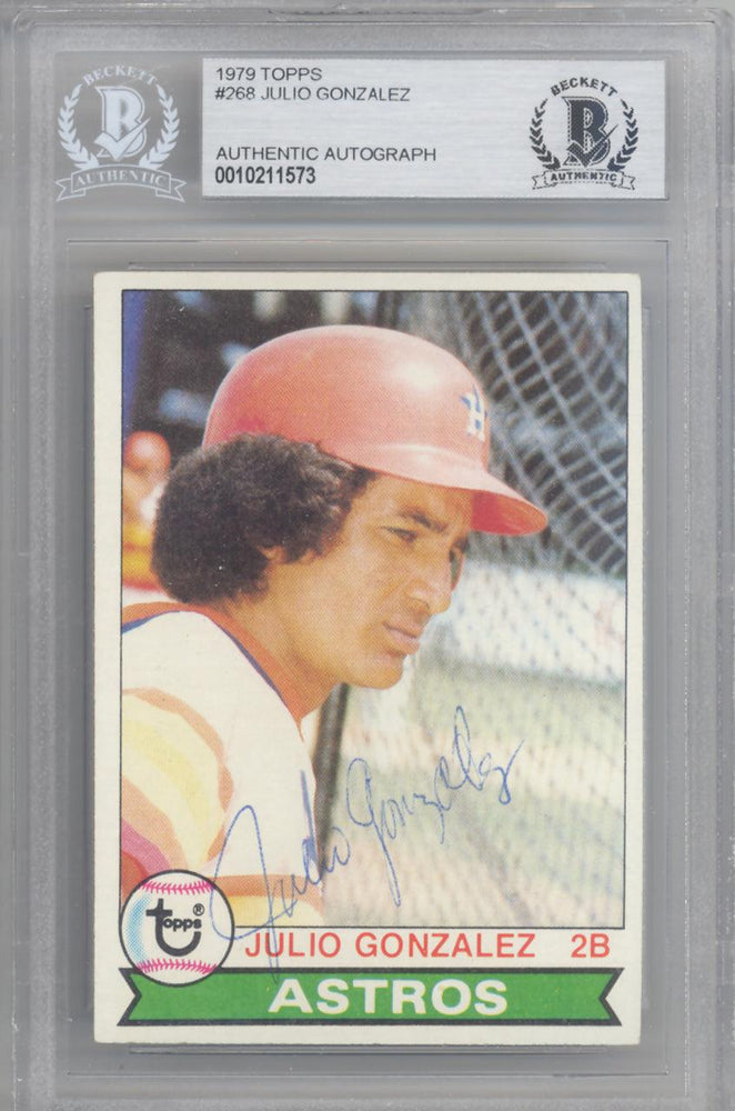 This is a 1979 Topps Card #268 that has been hand signed by Julio Gonzalez. It has been certified authentic by Beckett Authentication (BAS) and comes encapsulated in their tamper-proof holder.