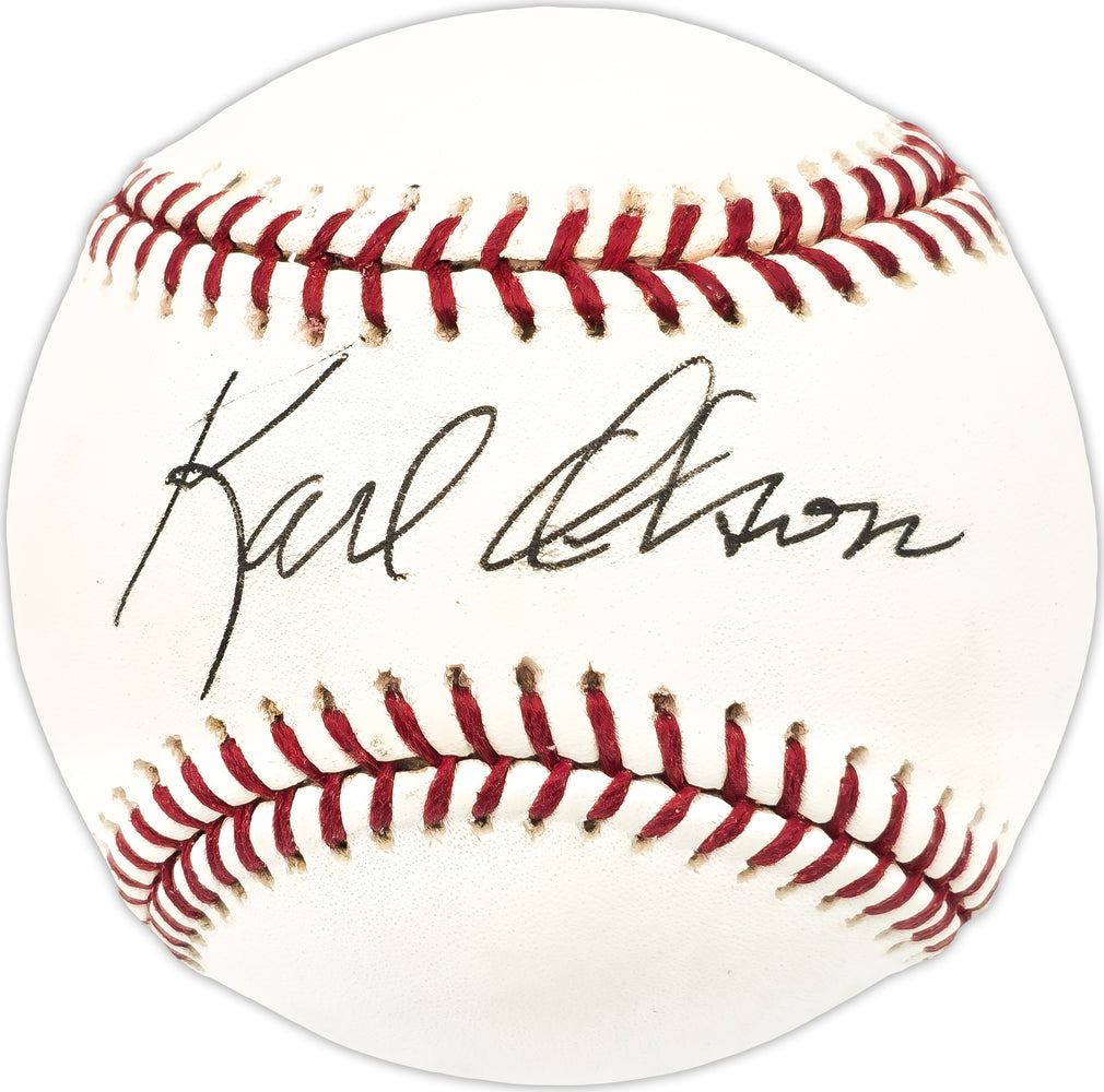 This is an Official American League Baseball that has been hand signed by Karl Olson. There is toning in the item as shown. This item has been certified authentic by Beckett Authentication (BAS) and comes with their tamper-proof QR Code hologram that can be verified on the Beckett-authentication.com.