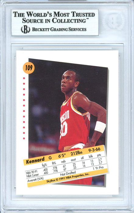 This is a 1991-92 Skybox Rookie Card #109 that has been hand signed by Kennard Winchester. It has been certified authentic by Beckett Authentication (BAS) and comes encapsulated in their tamper-proof holder.