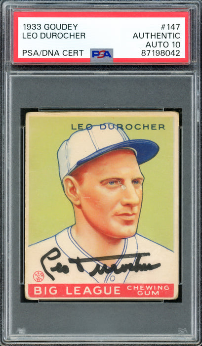 This is a 1933 Goudey Rookie Card #147 that has been hand signed by Leo Durocher. The condition of the signature was graded a Gem Mint 10 by PSA/DNA. It has been certified authentic by PSA/DNA and comes encapsulated in their tamper-proof holder.